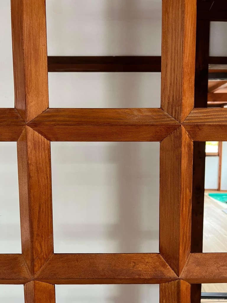農家らしい間取りの大きな田の字プランに、浴室の増築や土間の小部屋化が時代や住まい方に応じて、その都度改修が行われてきました。建物は北側にある北摂山系を背にして、南に大きな開口を設けられた配置です。その窓側にある縁側を隔て居室が庭に対面するプランとなっています。北側には日中も薄暗く湿気の感じる台所と浴室が増築されてありました。その部分は減築し、敷地境界からゆとりある空間を生み出すことにしました。そうすることで田の字居室に山側から通り抜ける風を確保し、どこにいても光や風を感じられるプランとなります。中間期には冷暖房費用の節減に努められるよう環境にも配慮をした計画としました。田の字プランは建具で仕切られた大きな空間が魅力的です。このメリットを活かせるよう、しなやかな構造躯体となるよう耐震補修計画をしています。耐力壁は在来の土壁をコアとして配置させながら、周辺に格子耐力壁を設置し、空間が閉鎖的にならないよう風や光が通る空間を実現させました。格子組は針葉樹の45角を捻子に組んだ相欠接ぎとし、今回耐力壁として構造設計者や大工と開発したものです。菱に転んだ捻子組が陰影のシャープな格子面を浮き立たせ、武骨な農家の柱梁組とのコントラストを明快にしています。